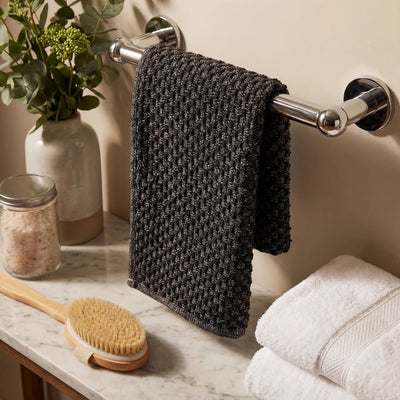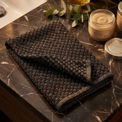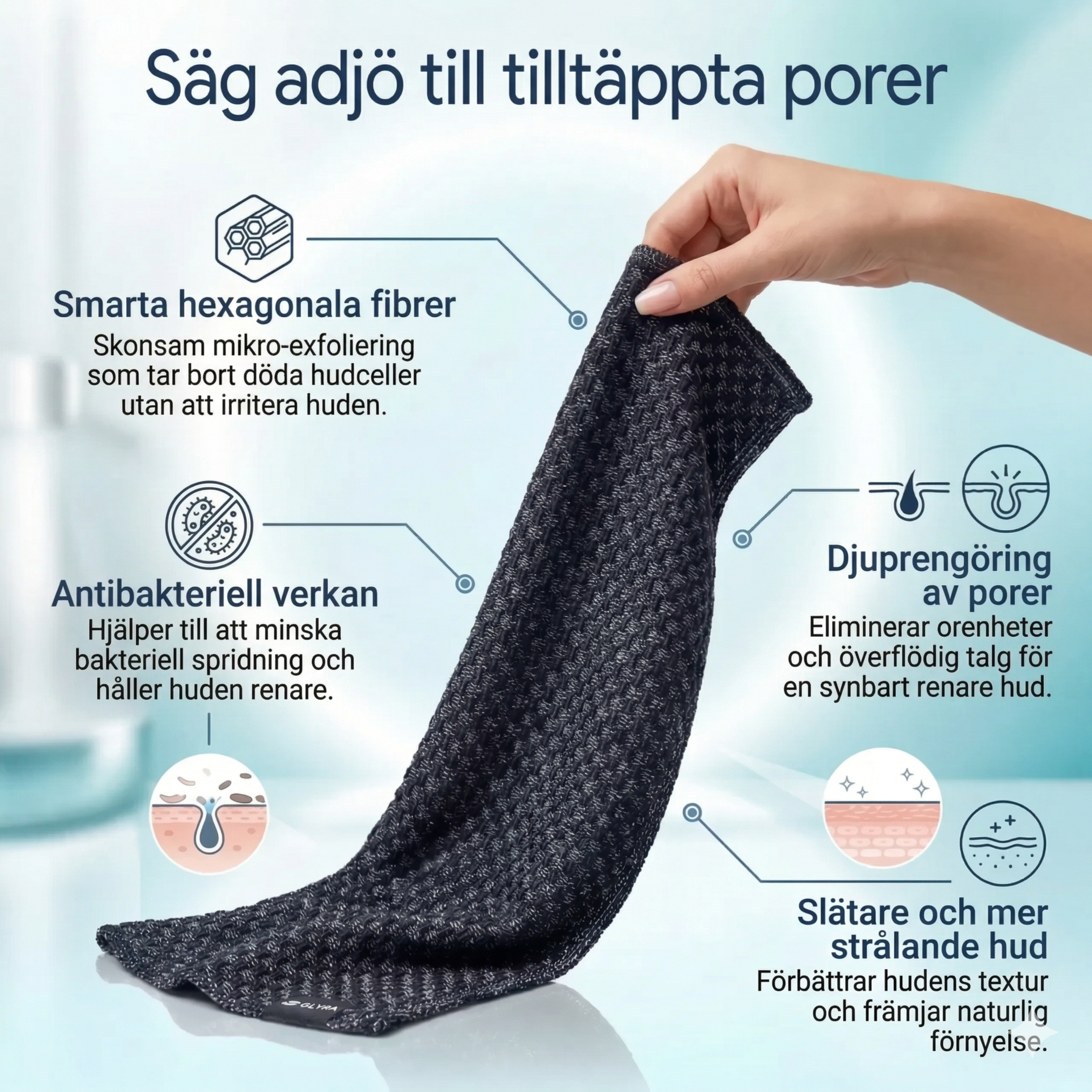 Vårt unika hexagonala vävmönster kombinerar två nivåer av exfoliering i en enda handduk: en mjuk sida för daglig användning och en texturerad sida för djupare exfoliering. Den avlägsnar försiktigt döda hudceller, stimulerar blodcirkulationen och främjar kollagenproduktionen, vilket bidrar till att jämna ut huden utan att skada hudbarriären.